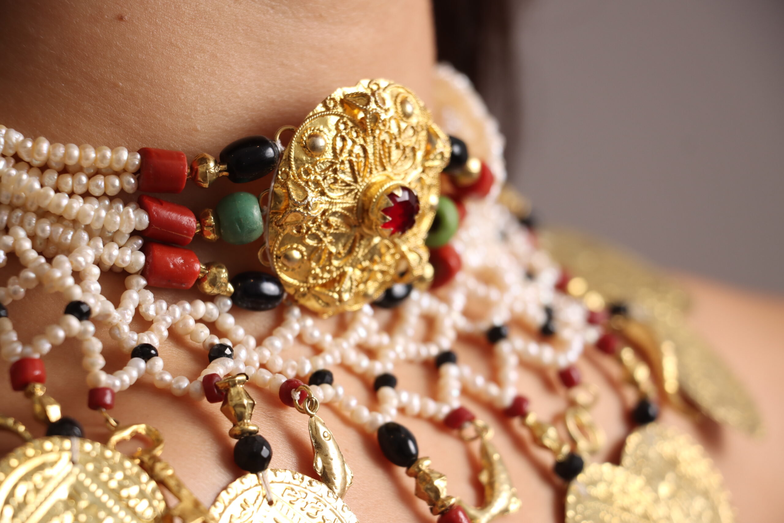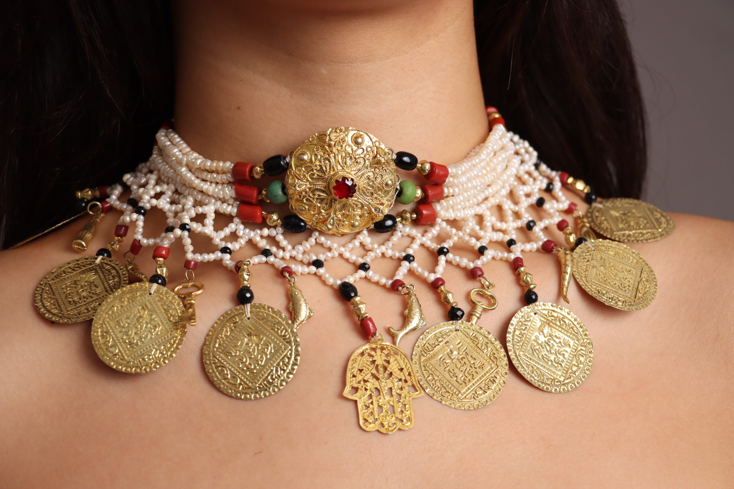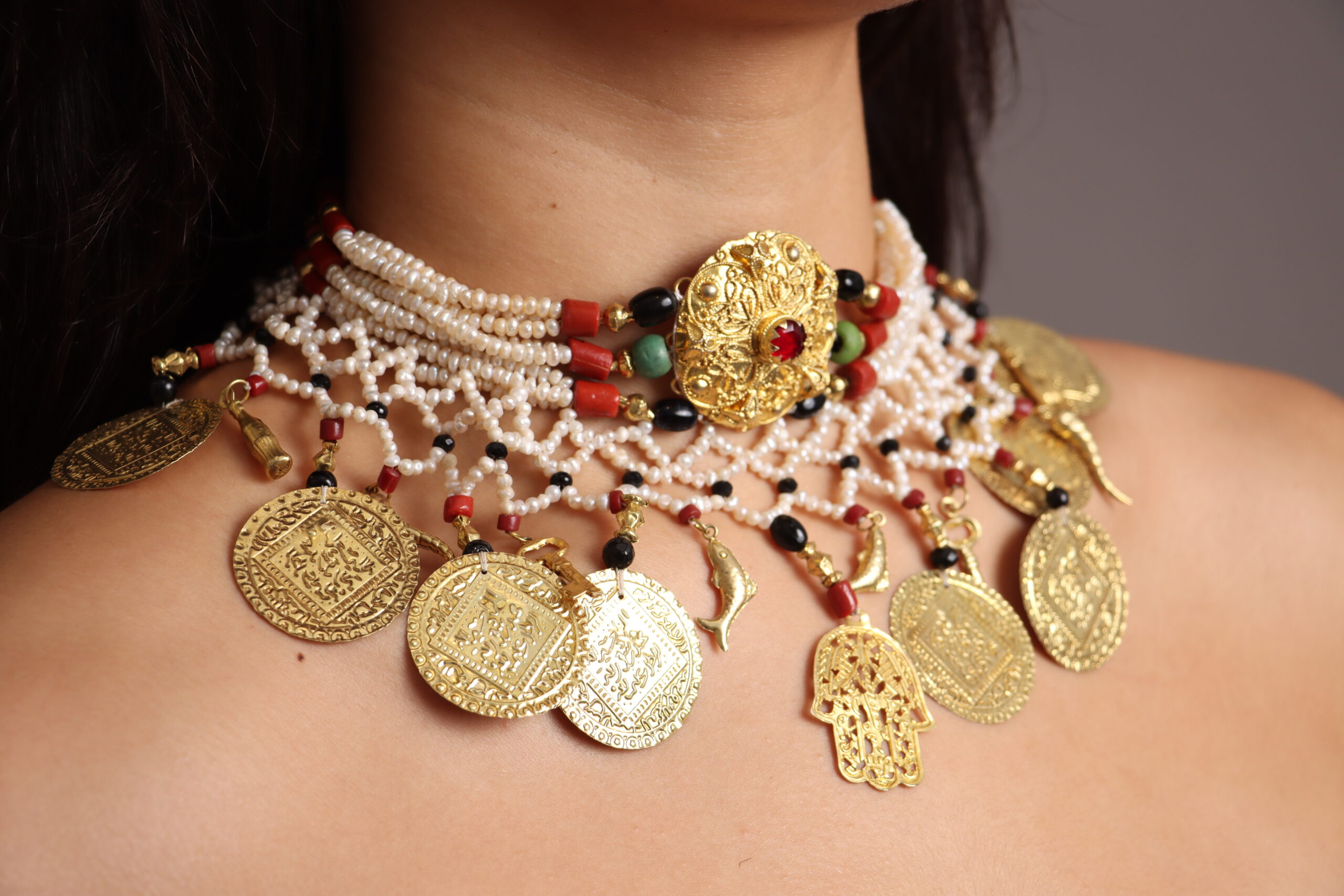 Necklace in cultured pearls, coral and rose gold plated Skhab.